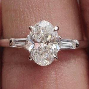 Introducing our exquisite Three Stone Oval Engagement Ring, a timeless symbol of love and commitment. This stunning ring features breathtaking oval lab grown diamonds with side tapered baguette diamonds, each hand-selected for their exceptional quality and radiance.