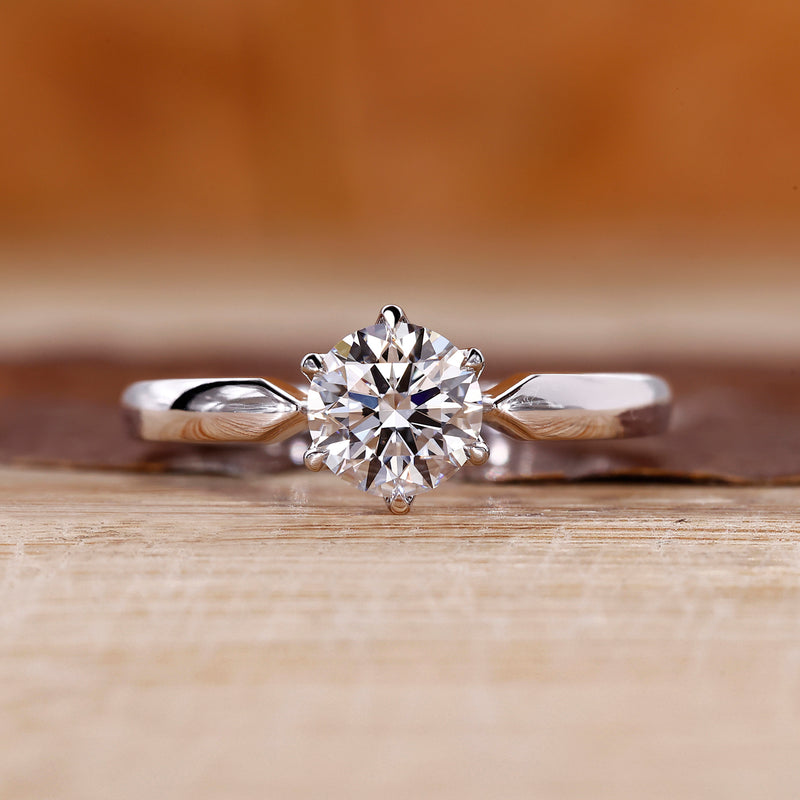 Round diamond solitaire engagement ring with tapered shank and six claw prong.